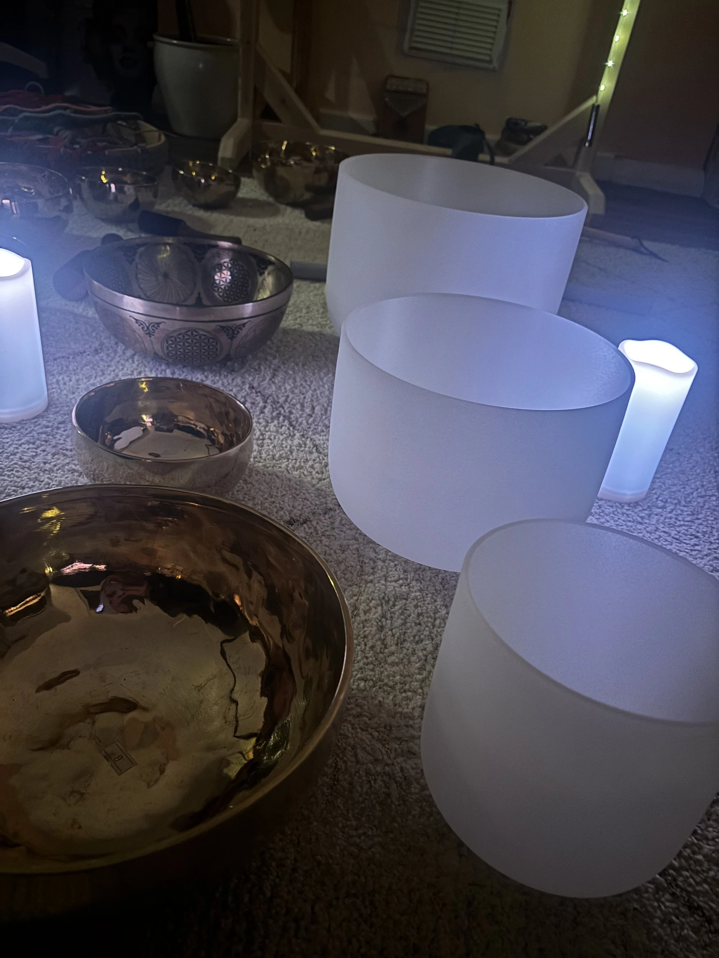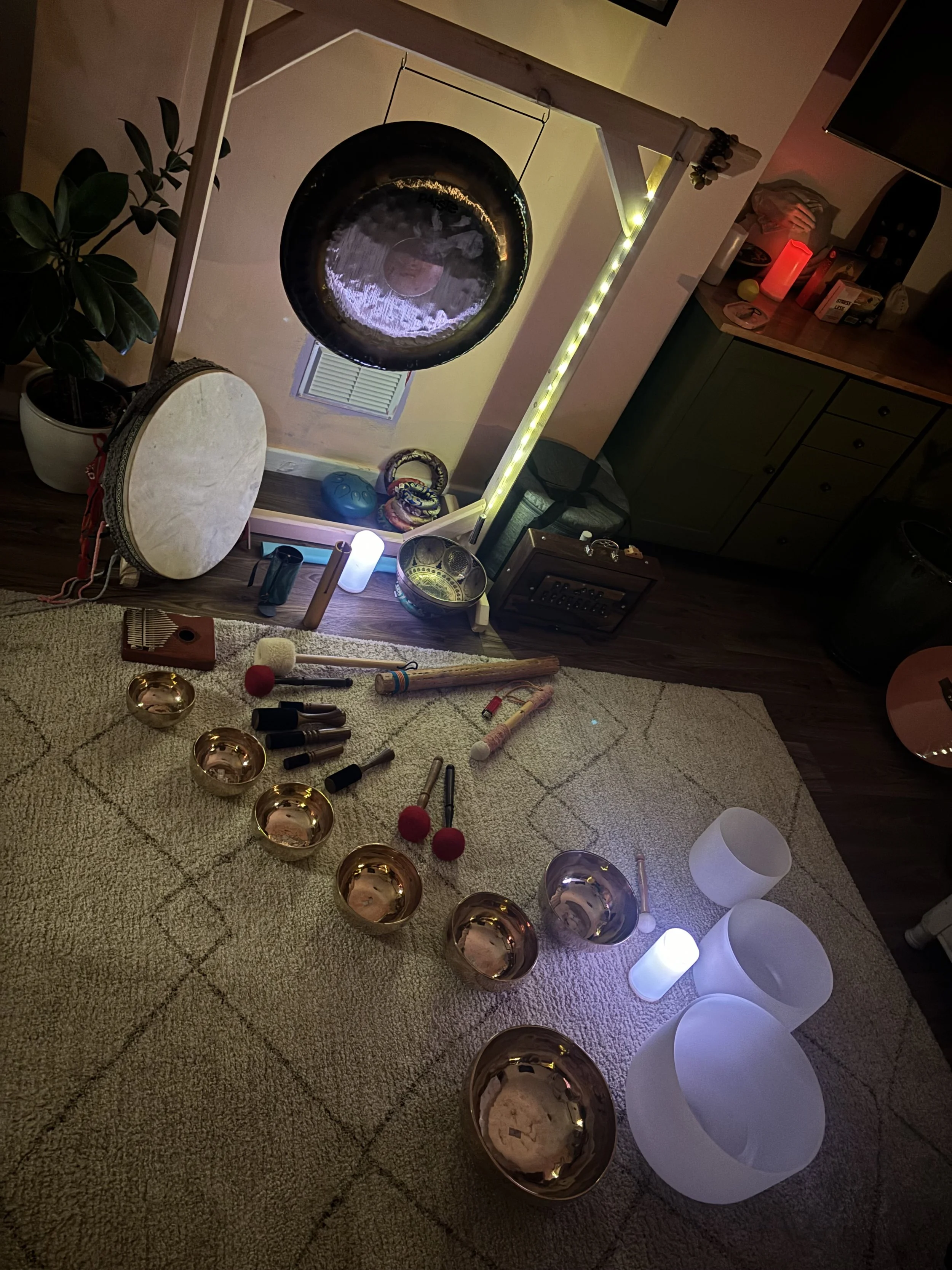 Energy healing session using the light and deep sound vibrations of tibetan & crystal bowls, rain, chimes and gongs.